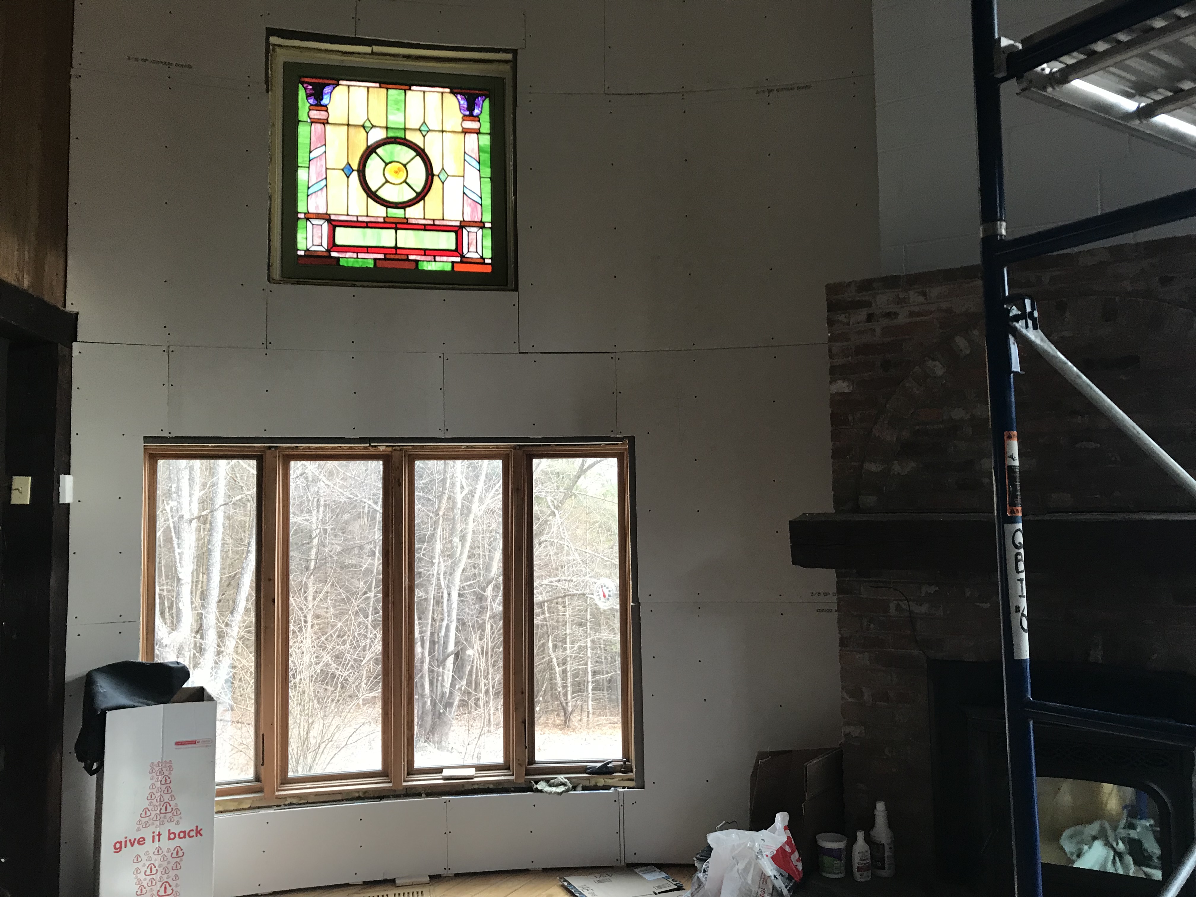 Stained glass, sheetrocked. Stained glass will go.